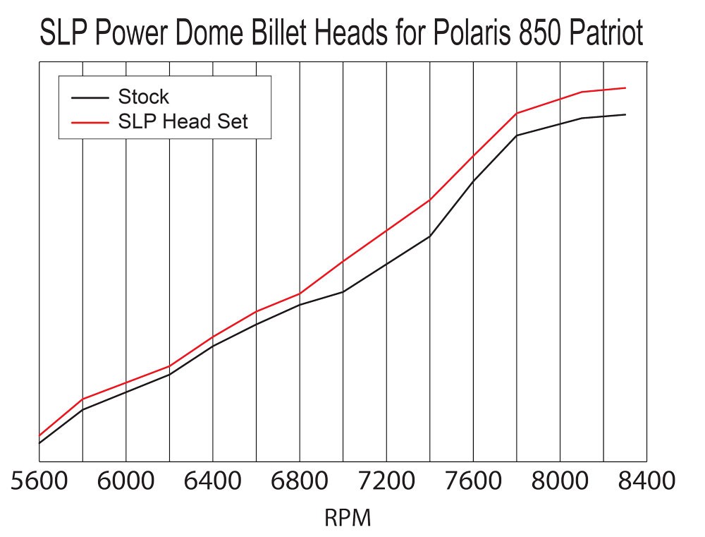 SLP has done it again! Providing more horsepower through combustion chamber design, these billet heads for the Polaris Patriot 850 engine deliver an impressive 6 horsepower peak with an additional 5 to 7 midrange. They are designed to maintain compatibility with 91 octane pump fuel for optimal reliability and consistency. Currently available for use with stock engine/pipe configuration as well as an SLP lightweight silencer and an SLP intake kit (SLP Stage 1.5, which provides a total of 7.8 horsepower peak) with no fuel management changes required.